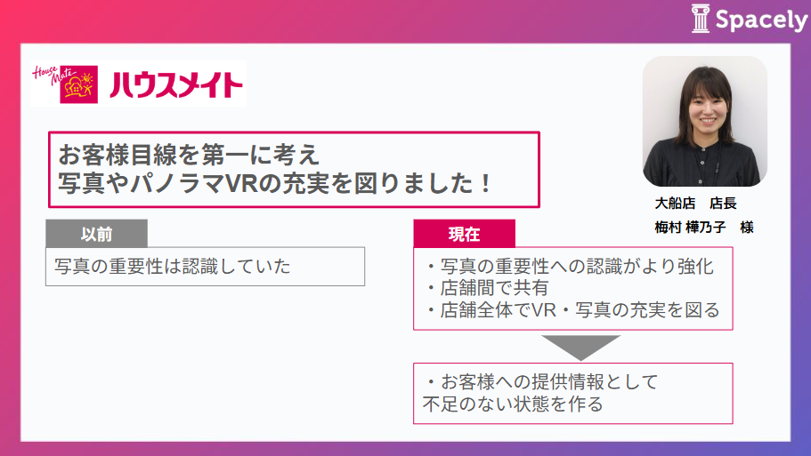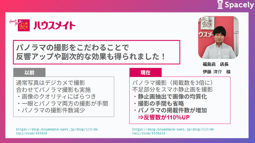 スペースリー導入後、パノラマとして撮影した画像を静止画で抽出することができるようになり、撮影者の技術が均質化されました。また、従来ではカメラと360度カメラをそれぞれで撮影していた手間が効率化され、結果として当店のパノラマの掲載数が昨年比で倍以上になり、反響数も1割増となりました。改めて写真撮影の重要性を感じています。