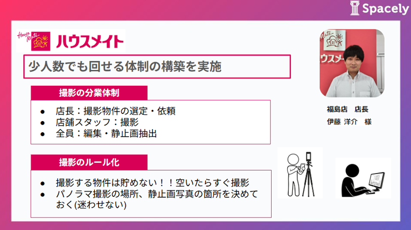 他のユーザー様からも「撮影する人がいない」「撮影する時間がない」という環境面での課題を伺うことは多いです。しかしながら4名体制でも撮影が可能な仕組みづくりをされ、反響数も1割増という実績も出されたとのこと、非常に素晴らしく、私たちも嬉しく思います。