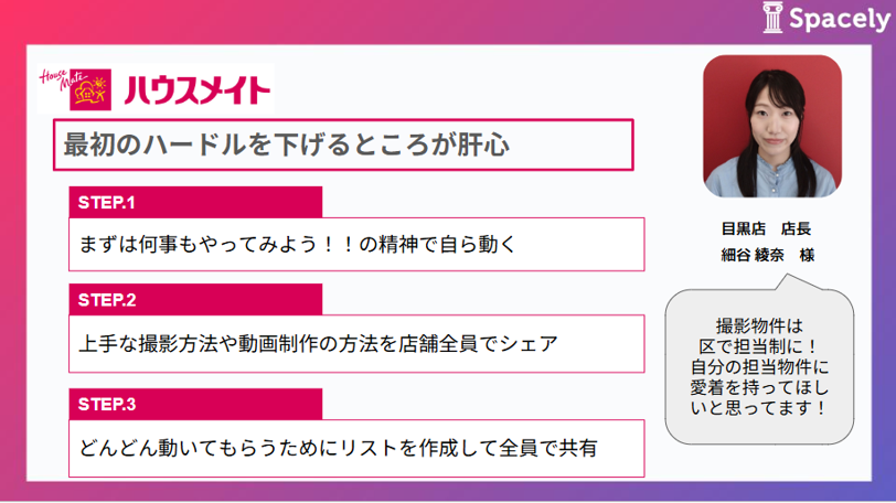 福島店はパノラマ写真のアップロード数第1位、大船店は通常写真のアップロード数第1位、そして目黒店ではスペースリーのアプリを使った動画作成数が第2位となっています。