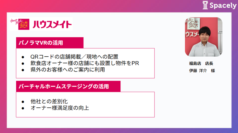 福島店では、スペースリー導入後から、VHS(バーチャルホームステージング)を主に営業ツールとして活用おり、お客様の反応も非常に良いです。特にオーナー様からの反応が良いです。飲食店を経営されているあるオーナー様にはVHSを大変気に入っていただき、「QRコードを自分のお店に置きたい」というお申し出をいただいたほどです。
