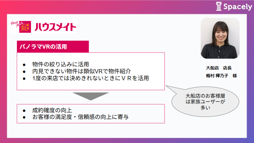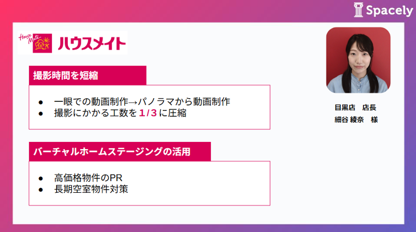 写真だけでは見えない細かいところやイメージしにくい生活動線を伝えられ、お客様に多くの判断材料をご提供することができる。結果的に内見数が減少し、内見の質が上がる。これはまさに私たちもぜひ皆様に実感していただきたいところです!