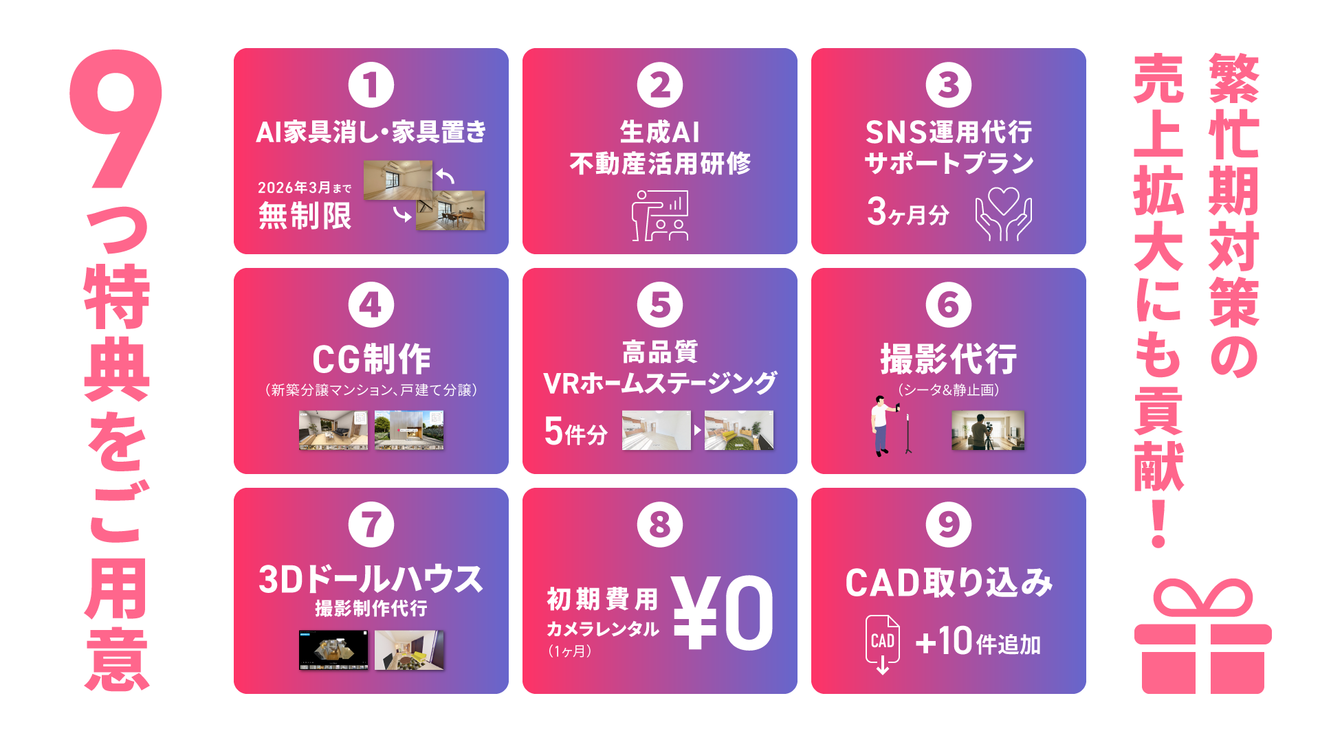 当社は高品質なコンテンツ提供を行うことで、不動産住宅事業者様の生産性向上と売上拡大に貢献をしてきました。そこで、不動産住宅業界は1月以降繁忙期を迎えるにあたり、当社サービスをご利用いただくことで、皆様の繁忙期の業務効率を実現すべく9つの豪華特典プレゼントキャンペーンを実施させていただきます。これを機にぜひご利用ください。
