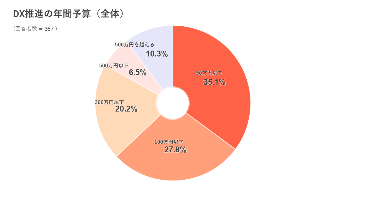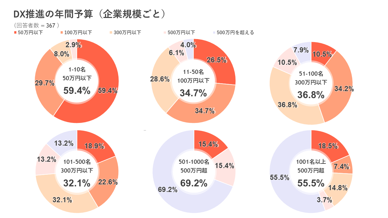 ◆ DX推進のための年間予算は従業員10名以下では「50万円以下」、11-50名以下では「100万円以下」、51-100名以下では「300万円以下」、101-500名以下では「300万円以下」、501名以上では「500万円を超える」が最多