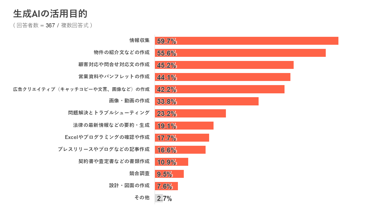 活用の目的は「情報収集」「住宅・物件の紹介⽂などの作成」「顧客対応や問合せ対応文の作成」などが上位となりました。