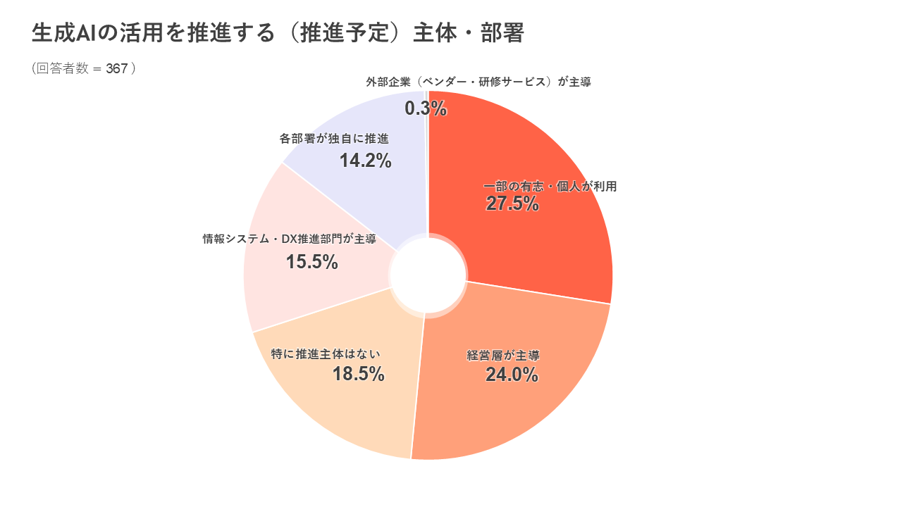 生成AIの活用を推進する主体・部署について質問したところ、「一部の有志・個人が利用」が最も多く27.5%、次いで「経営層が主導」が24.0%となりました。また、「外部企業(ベンダー・研修サービス)が主導」は0.3%に留まりました。