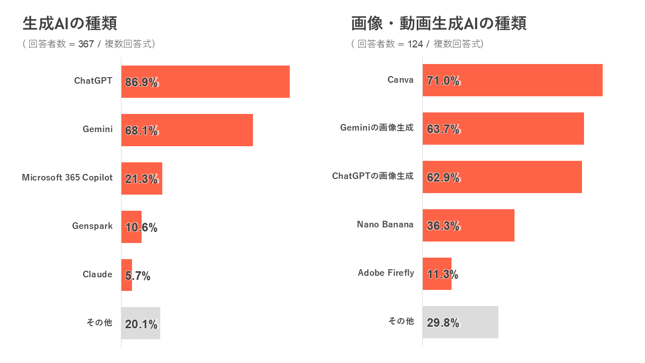 ◆ 利用している生成AIは「ChatGPT」が86.9%で最多、画像・動画生成AIでは「Canva」が71.0%で首位