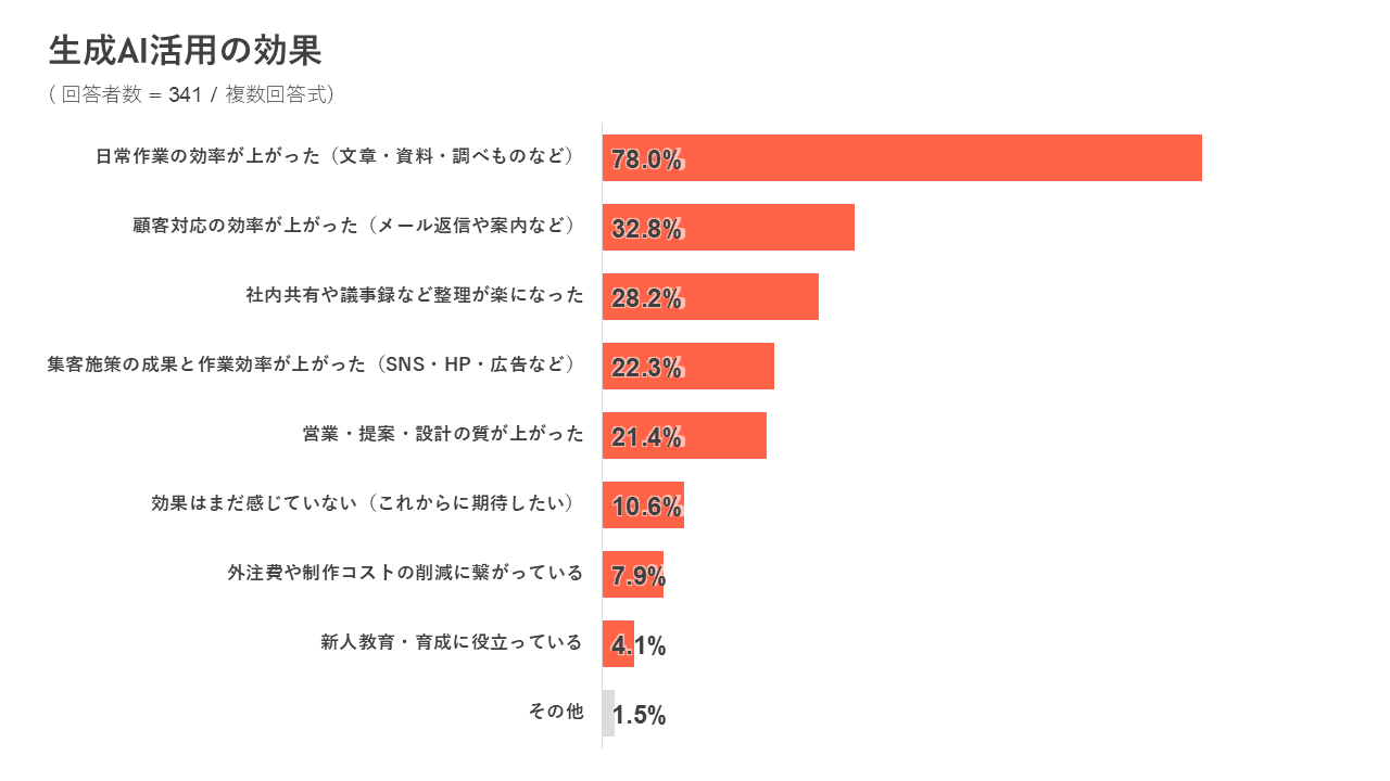 実際に感じている効果について質問したところ、「日常作業の効率が上がった」と回答した人が78.0%で最多、次いで「顧客対応の効率が上がった」が32.8%となりました。