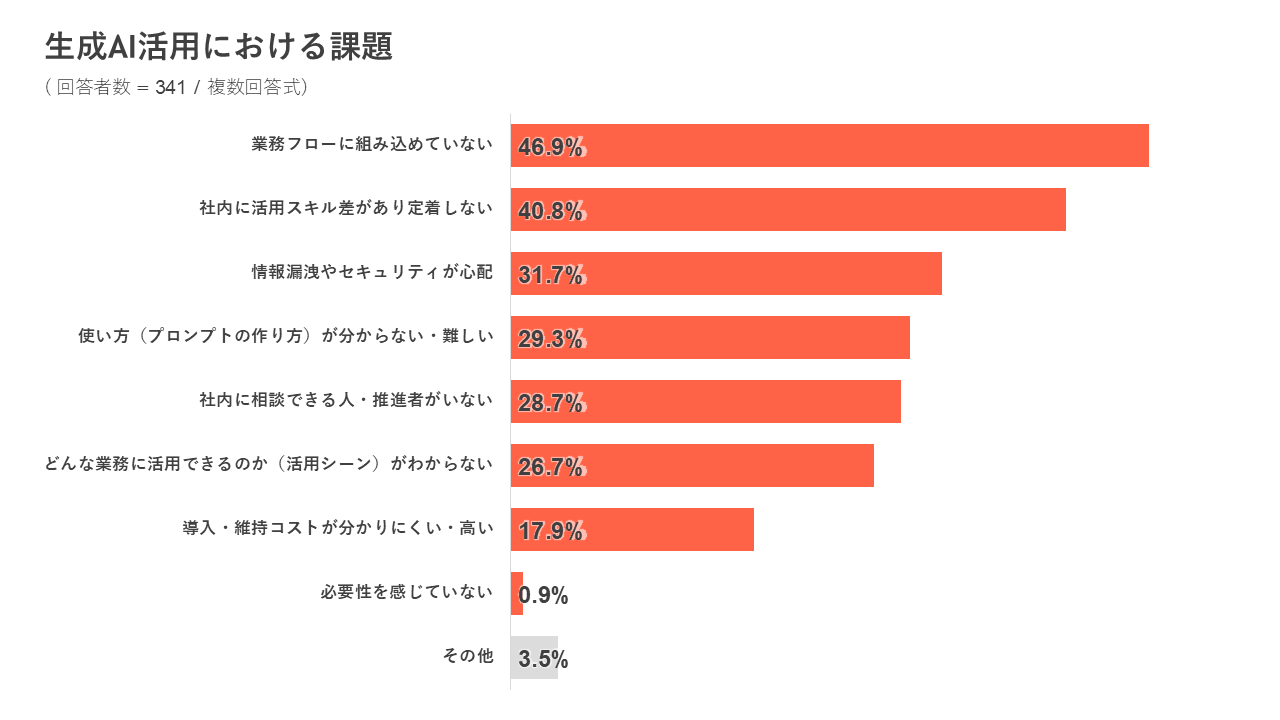 一方で、生成AI活用における課題についての質問では「業務フローに組み込めていない」「社内に活用スキル差があり定着しない」「情報漏洩やセキュリティが心配」などが上位となりました。