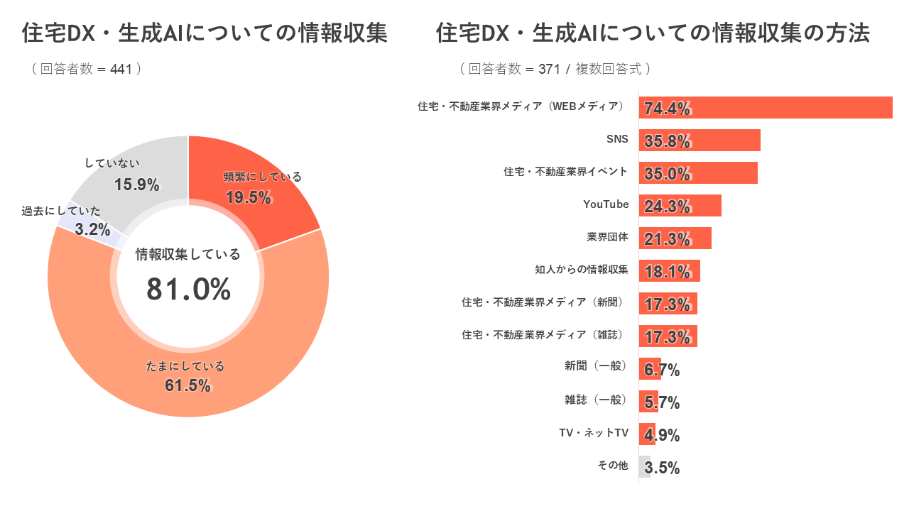 ◆ 住宅DX・AIについて「頻繁に情報収集している」は19.5%、「たまに情報収集している」は61.5%、情報収集に最も活⽤されているのは「住宅・不動産業界メディア(WEB)」