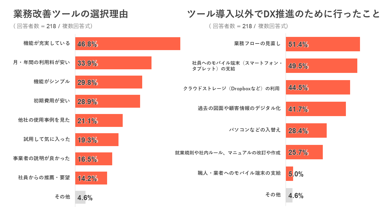 「DXに取り組んでいる(いた)」と回答した方に対して、導入した業務改善ツールの選定理由を質問したところ、「機能が充実している」が最多で46.8%、次いで「月・年間の利用料が安い」が33.9%となりました。 また、ツール導入以外でDX推進のために行ったことについて質問したところ、「業務フローの見直し」「社員へのモバイル端末の支給」が上位の回答となりました。