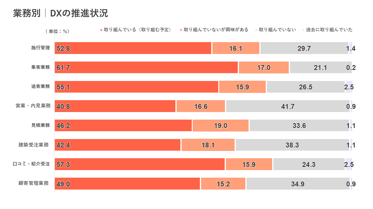 具体的な業務別でDX推進状況について質問したところ、「集客業務」が最多で61.7%、次いで「口コミ・紹介受注」が57.3%となりました。全ての業務において、50%前後の事業者がDXの推進をしており、「興味がある」まで含めると3社中2社と多くの事業者がDX推進に興味を持っている・力を入れていることが伺えます。