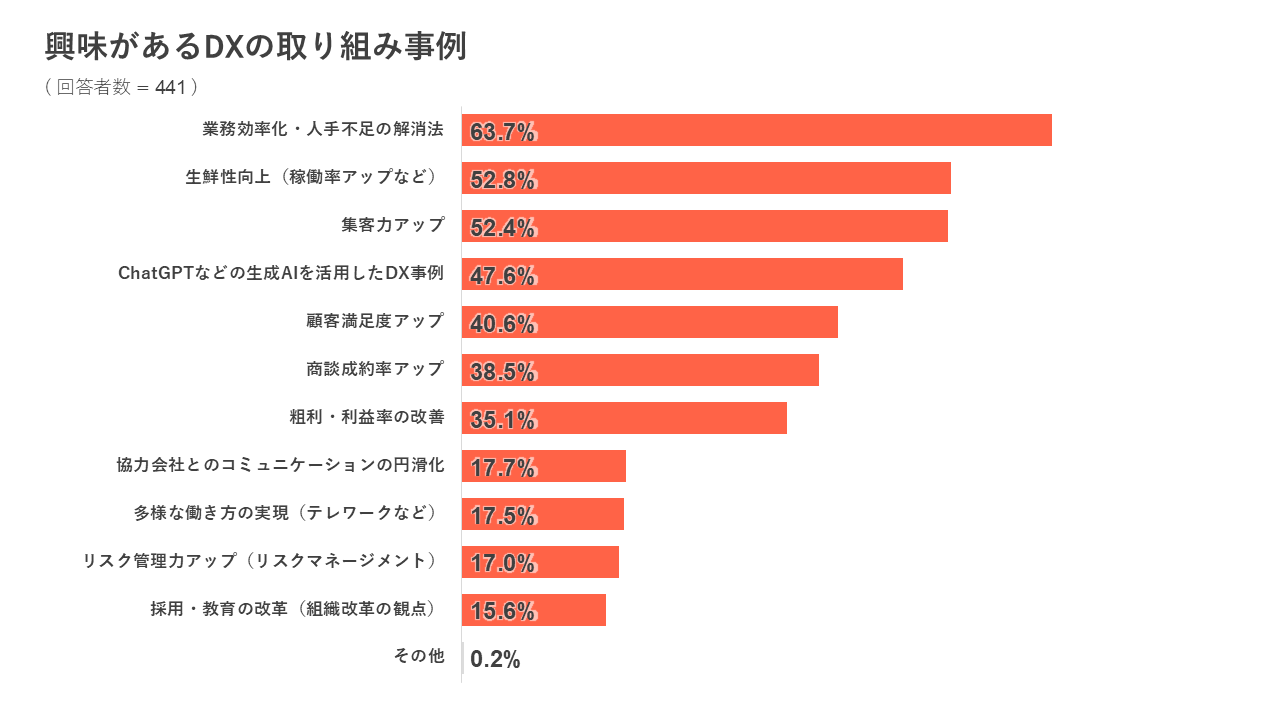 ◆ 興味があるDXの事例は「業務効率化・人手不足の解消」が最多で63.7%、次いで「生産性向上(稼働率アップなど)」が52.8%、「集客力アップ」が52.4%