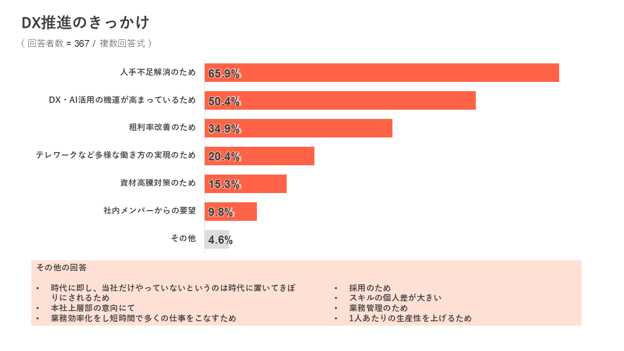 DXに取り組もうと思ったきっかけについて質問したところ、65.9%が「人手不足解消のため」と回答しました。次いで「DX・AI活用の機運が高まっているため」が50.4%、「粗利率改善のため」が34.9%でした。