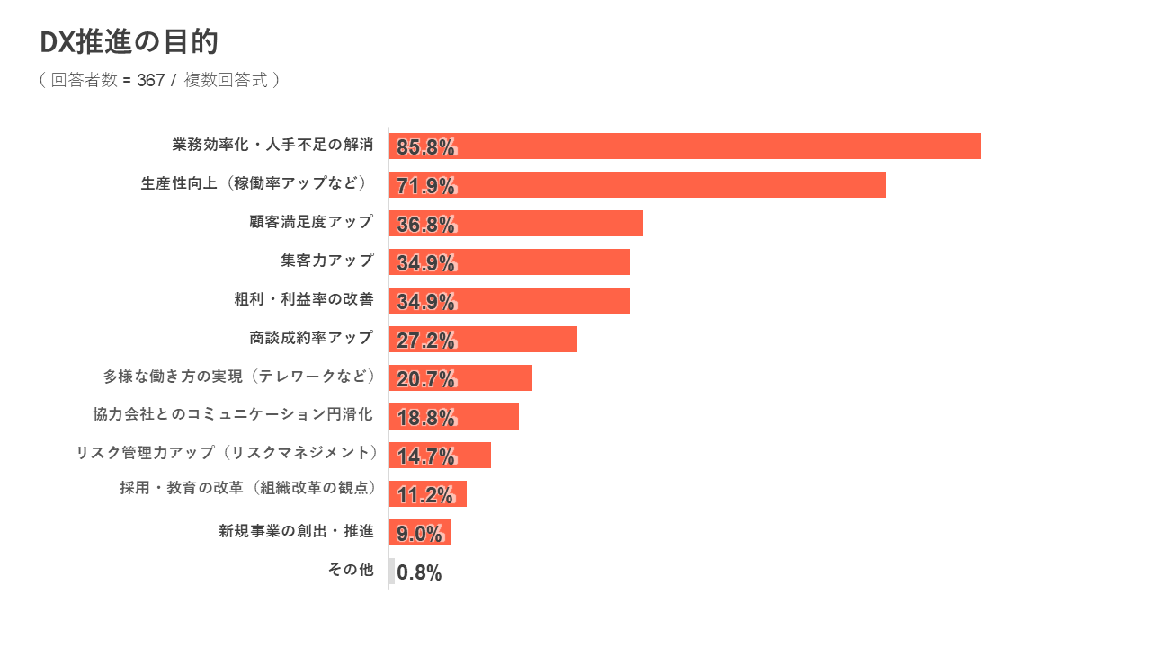 DX推進の目的について質問したところ、「業務効率化」が最も多く85.8%、次いで「生産性向上(稼働率アップなど)」が71.9%、顧客満足度アップが36.8%の回答となりました。