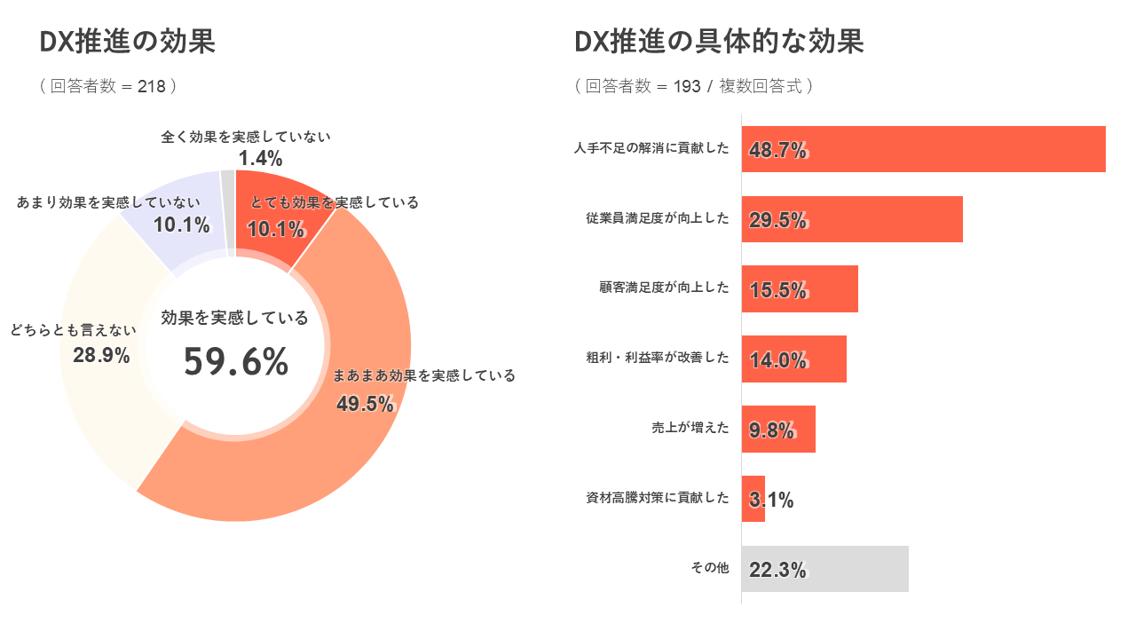 DXの効果について質問したところ、「とても効果を実感している」「まあまあ効果を実感している」をあわせると「効果を実感している」という回答が59.6%でした。同時に、DX推進の具体的な効果についても質問したところ、「人手不足の解消に貢献した」が最も多く48.7%となりました。