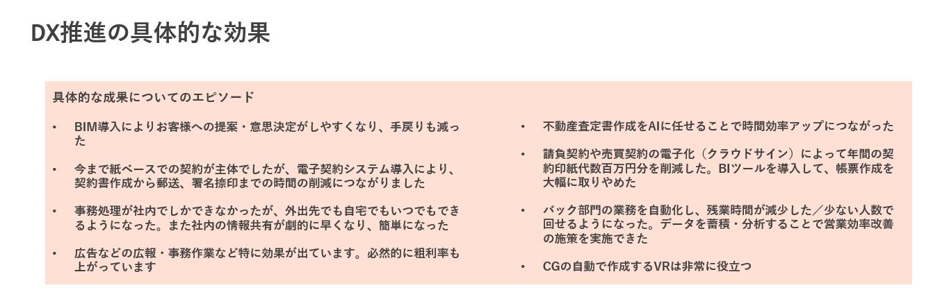 「請負契約や売買契約の電子化(クラウドサイン)によって年間の契約印紙代数百万円分を削減した。BIツールを導入して、帳票作成を大幅に取りやめた」