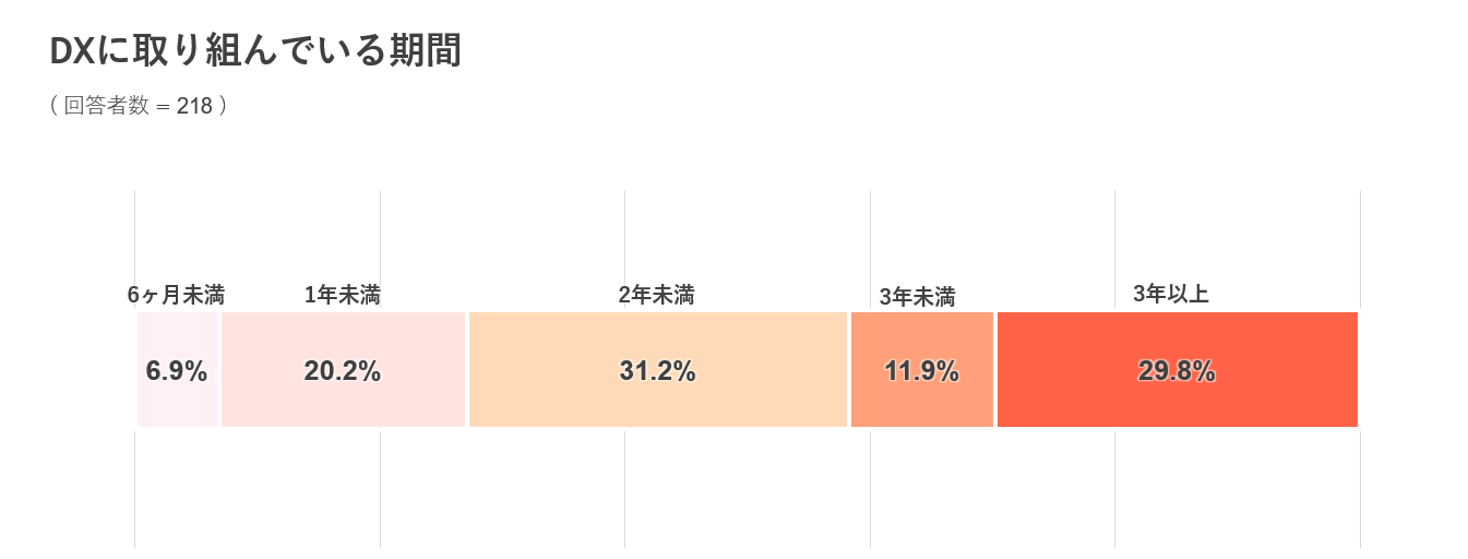 「DXに取り組んでいる(いた)」と回答した方に対して「DXに取り組んでいる(いた)期間をお教えください」という質問に対し、29.8%が「3年以上」と回答しました。直近1年以内と回答した企業は27.1%で、昨年から取り組みを開始した企業も多いことが分かります。