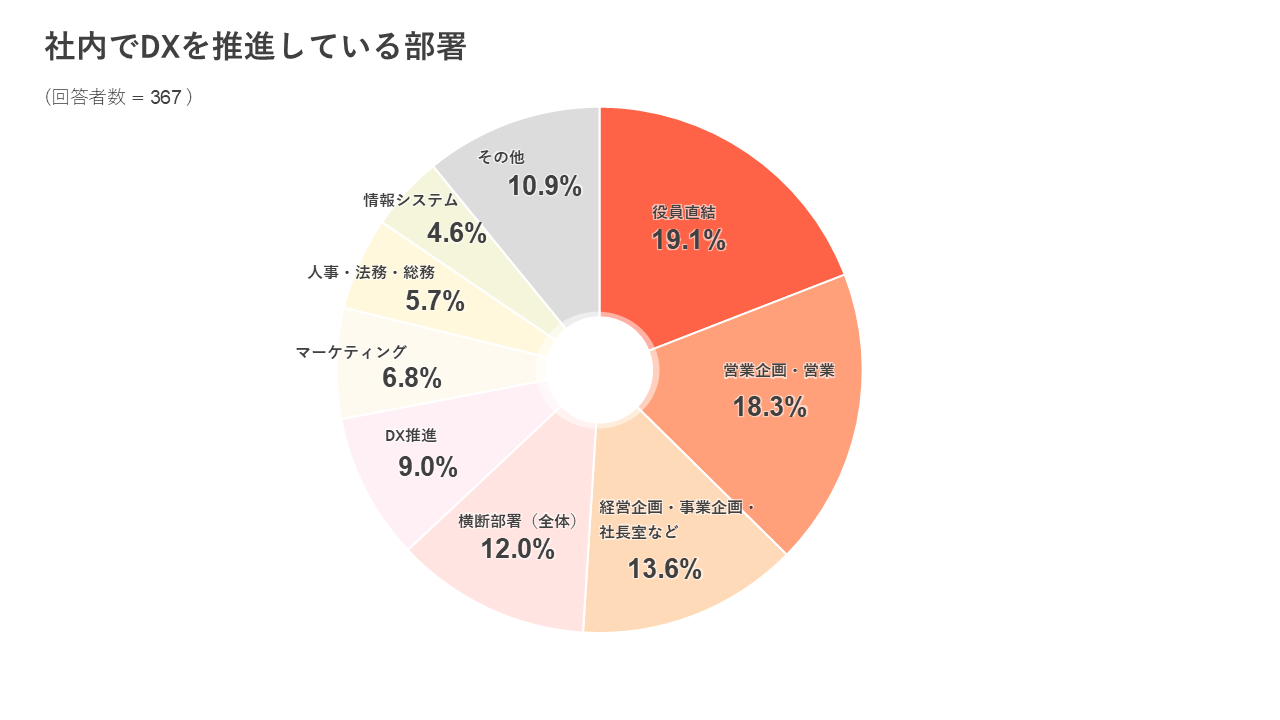 DX推進の担当部署について質問したところ、「役員直結」が最も多く19.1%で、次いで18.3%が「営業企画・営業部」と回答しました。また「DX推進部」という専門部署が担当しているというケースも9.0%ありました。